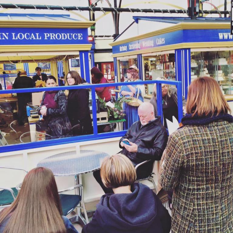 The original plan was to go to the Hat Museum in Stockport, followed by afternoon tea in The Plaza. But a burst main near the hat museum meant it was closed – move on to plan B! We all met up at Staircase house… We could go around and draw things in there. I’d never been so thought it was a great opportunity to have a look 🙂 …that’s when I spotted the DRESSING UP BOX!!! Now those of you who know me, know I can’t resist dressing up! Perfect! What made it even more incredible was that the kind people at Staircase House let myself, Eleanor and Chrissy dressed up (and looking fabulous if not a tad bonkers!) out into Stockport Market where we could draw each other and try and keep warm! 😀